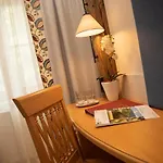 As conveniências no sala incluem escrivaninha, TV de tela plana com canais via satélite e TV via satelite, bem como casas de banho privadas com casa de banho separada e chuveiro, juntamente com secador de cabelo e lençóis de banho. Mobiliário de madeira, incluindo mesa de trabalho, são apresentados.